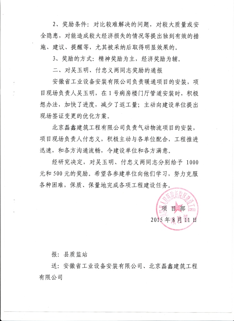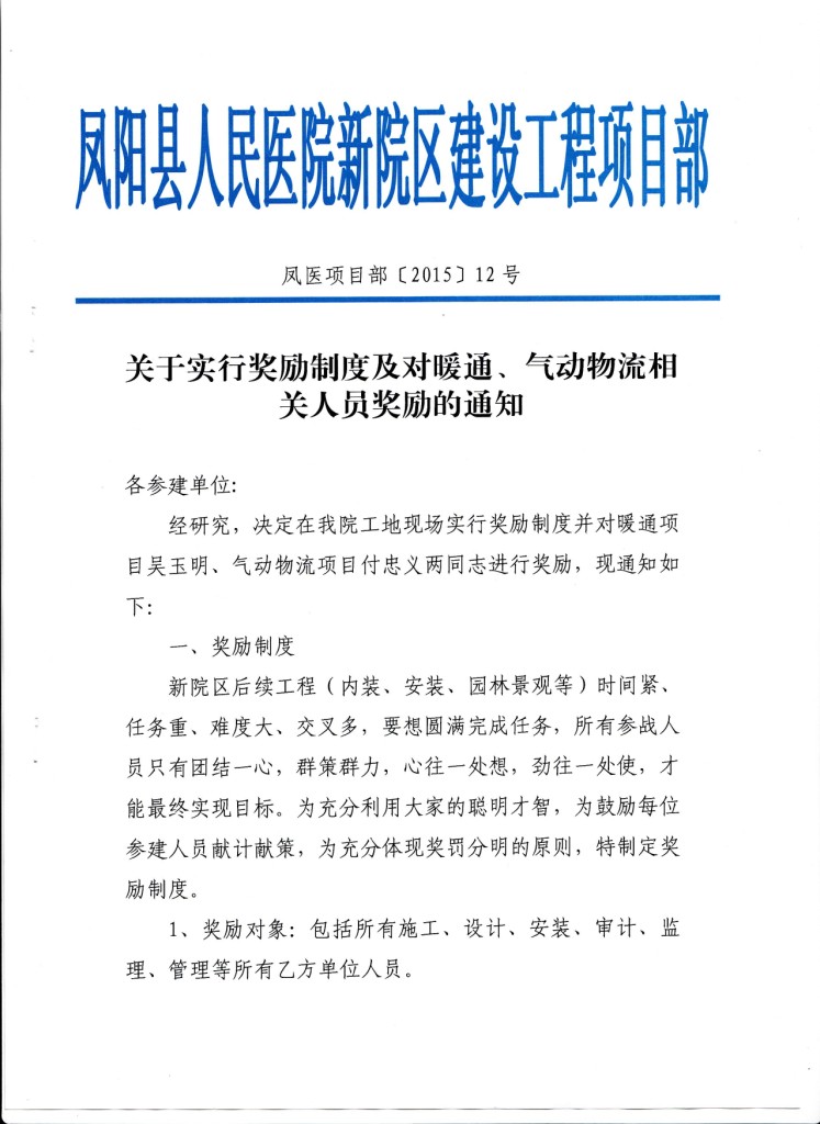 8月11日,鳳陽(yáng)縣人民醫(yī)院新院區(qū)建設(shè)工程項(xiàng)目部發(fā)來(lái)賀文,就公司第九分公司承攬的鳳陽(yáng)縣人民醫(yī)院新院區(qū)暖通項(xiàng)目安裝工程表示肯定,并對(duì)該項(xiàng)目的現(xiàn)場(chǎng)負(fù)責(zé)人吳玉明同志給予表彰和獎(jiǎng)勵(lì)通報(bào)。