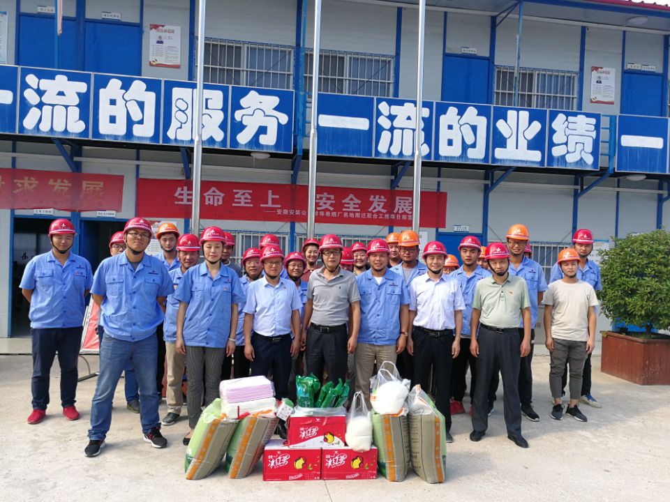 炎炎夏日、氣溫不斷攀升。為保障一線員工身體健康,7月31日下午,公司副總經(jīng)理劉安俊,公司紀(jì)委書記、工會(huì)主席李寬旭來到安徽中煙蚌埠卷煙廠項(xiàng)目部施工現(xiàn)場(chǎng),看望慰問奮戰(zhàn)在一線的員工,為他們送去了綠豆、白糖、風(fēng)油精、十滴水等防暑降溫用品,帶來了濃濃的關(guān)愛和絲絲清涼。