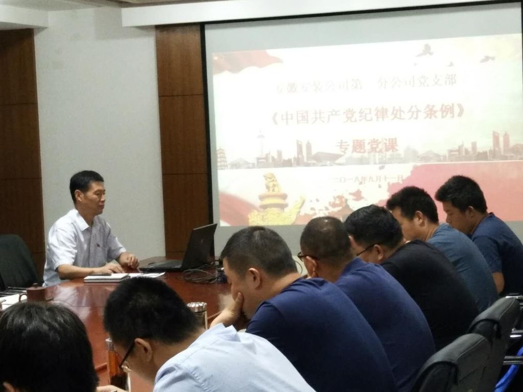 9月11日,第一分公司黨支部開展“黨支部書記上黨課”主題黨日活動。分公司黨支部書記胡迎東以新修訂的《中國共產(chǎn)黨紀(jì)律處分條例》為主題,采用PPT的形式為全體黨員、分公司領(lǐng)導(dǎo)班子成員、機關(guān)部門負(fù)責(zé)人、在肥項目經(jīng)理上了一堂生動的黨課。