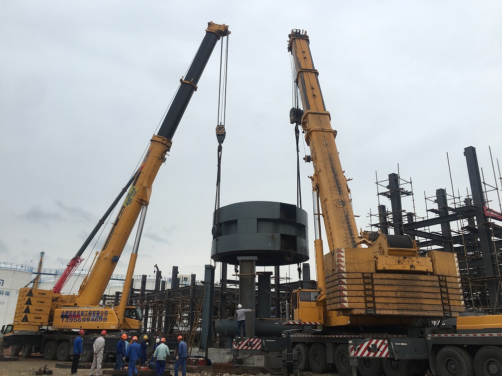 本次吊裝的反應(yīng)器中段部分重達220噸,分公司領(lǐng)導(dǎo)高度重視,吊裝前期,邀請公司總工吳繼成、總工辦主任牛守義和安全部王岳濤經(jīng)理親臨項目部參與設(shè)備吊裝的專題方案討論定稿工作。當日上午,吊裝現(xiàn)場準備工作緊張卻又有條不紊的進行,項目經(jīng)理李子鳳向全體“參戰(zhàn)”員工進行了安全交底,工作人員對兩臺分別為500T、350T吊車的站位及性能再次確認,現(xiàn)場機具、人員均按既定方案實施。分公司經(jīng)理史崇松、業(yè)主單位負責人、監(jiān)理全程在現(xiàn)場“督戰(zhàn)”,全體工作人員經(jīng)過四個小時的奮戰(zhàn),吊裝作業(yè)圓滿結(jié)束。