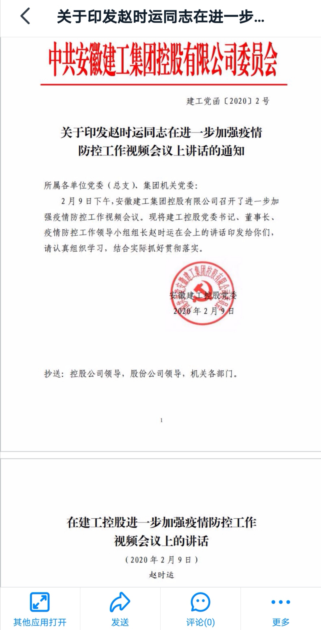 2月11日,安徽安裝公司通過釘釘日志、疫情防控群等網(wǎng)絡(luò)形式,迅速將《集團(tuán)公司黨委書記、董事長趙時運(yùn)在進(jìn)一步加強(qiáng)疫情防控工作視頻會議上的講話》精神,傳達(dá)到每名職工,做到人人皆知,認(rèn)真加以貫徹落實(shí)。