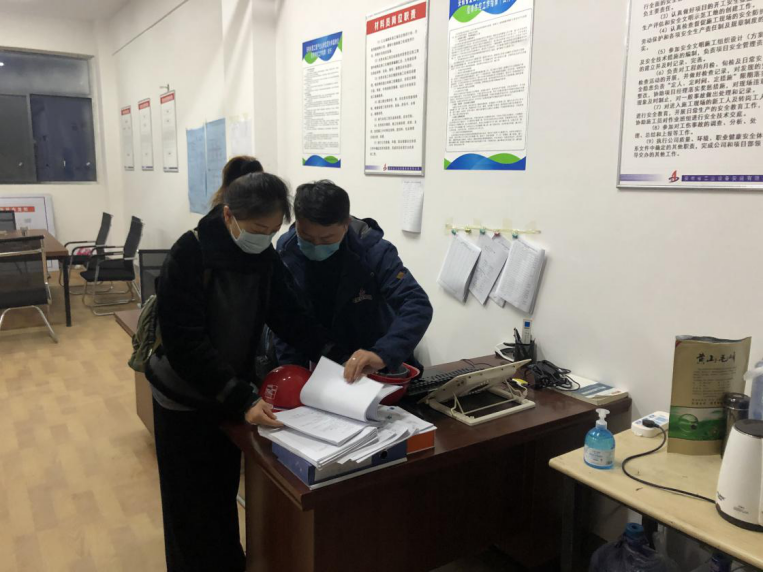 來到施工現(xiàn)場,檢查組一行首先查看了防疫物資儲備情況、返崗勞務(wù)作業(yè)人員進出工地人員排查隔離情況,現(xiàn)場衛(wèi)生消毒、清潔打掃、體溫檢測、勞動防護進場等,接著實地查看了工程的施工進展情況。