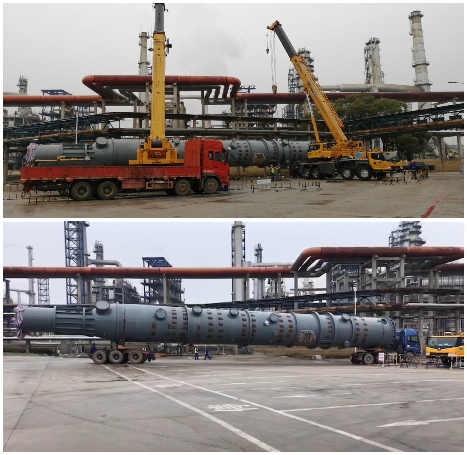 “Ⅰ、Ⅱ硫磺回收裝置增設(shè)煙氣后堿洗流程項(xiàng)目”是能使煙氣SO2排放濃度從原先的50mg/m3下降至≤10mg/m3的環(huán)保工程。但該項(xiàng)工程僅一個脫硫塔下段就高達(dá)33米,重達(dá)58噸,體積十分龐大,而現(xiàn)場存在作業(yè)場地狹小,固有障礙物多、吊重荷載大等諸多問題,無法將設(shè)備一次性運(yùn)至施工現(xiàn)場并進(jìn)行下段焊接梯子、平臺等附塔“穿衣戴帽”作業(yè)。對此,項(xiàng)目部多次優(yōu)化倒運(yùn)方案,提前合理部署,采用額定荷載分別為220噸和90噸的汽車吊實(shí)施雙機(jī)抬吊作業(yè)和專為公路橋梁設(shè)計(jì)使用的炮車運(yùn)輸,從而順利完成了倒運(yùn)工作。同時,為爭取時間,安排班組實(shí)行夜間倒班制,管理人員輪班制,為接下來的脫硫塔“穿衣戴帽”和上下段空中組對焊接作業(yè)爭取了寶貴時間。