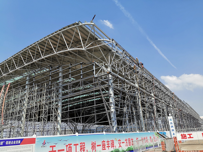 蚌埠水利科學研究院淮河試驗研究中心一期工程主要施工內容為新建水工河工模型試驗鋼結構及附屬土建工程,建筑面積約20000㎡,結構形式為排架柱(圓鋼管)+三肢管桁架結構,構件高度24米,跨度97.6米(單跨跨度為48.8米),抗震設防烈度為7度,9000多根鋼管,用量1800多噸,目前安徽省建設第二大跨度的鋼結構工程,是安徽安裝公司承接的最大高跨、最大規(guī)模、最大施工難度、最具技術含量的大型安裝項目。