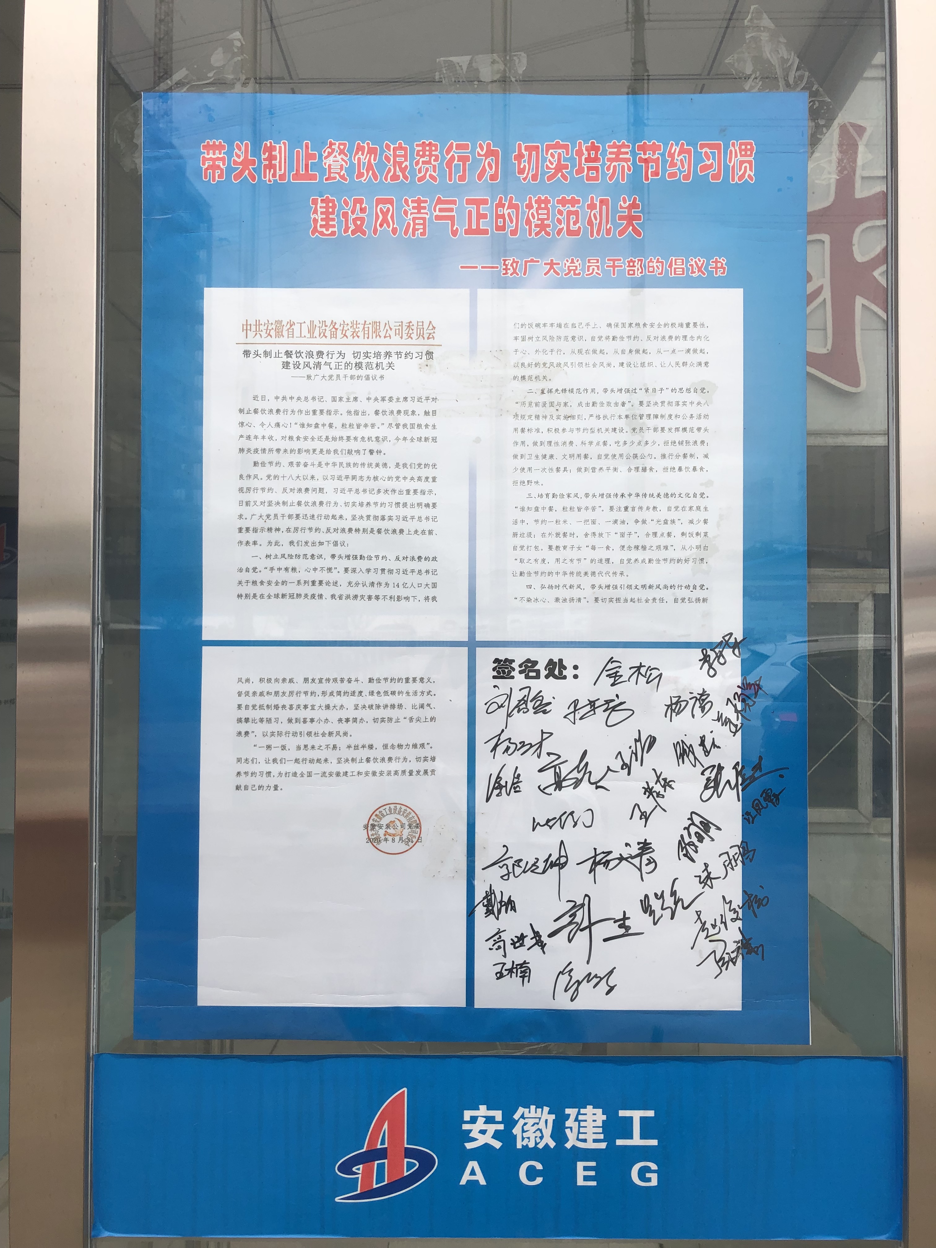 10月15日,房建(裝飾)分公司黨支部在阜陽潁東中醫(yī)院PPP建設項目組織集中學習宣傳貫徹習近平總書記考察安徽重要講話精神及開展帶頭制止餐飲浪費行為切實培養(yǎng)節(jié)約習慣的倡議簽名活動。