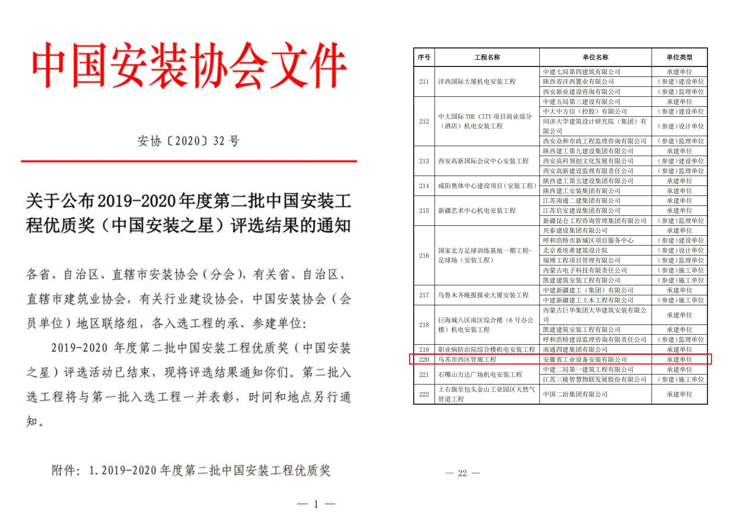 12月10日,經(jīng)中國安裝協(xié)會評選,由安徽安裝公司承建的新疆烏蘇市西區(qū)管廊工程成功獲得中國安裝工程優(yōu)質(zhì)獎 (中國安裝之星),這也是我公司首獲的工業(yè)設備安裝類中國安裝工程優(yōu)質(zhì)獎。