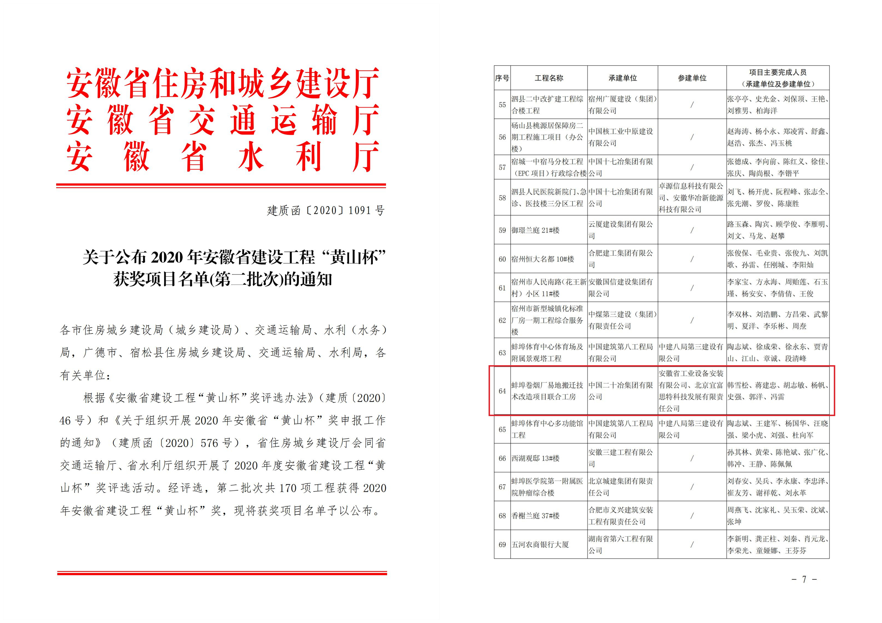 12月14日,經(jīng)安徽省住房城鄉(xiāng)建設廳會同省交通運輸廳、省水利廳評選,安徽安裝公司蚌埠卷煙廠易地搬遷技術(shù)改造項目聯(lián)合工房等機電安裝工程榮獲“黃山杯”獎。