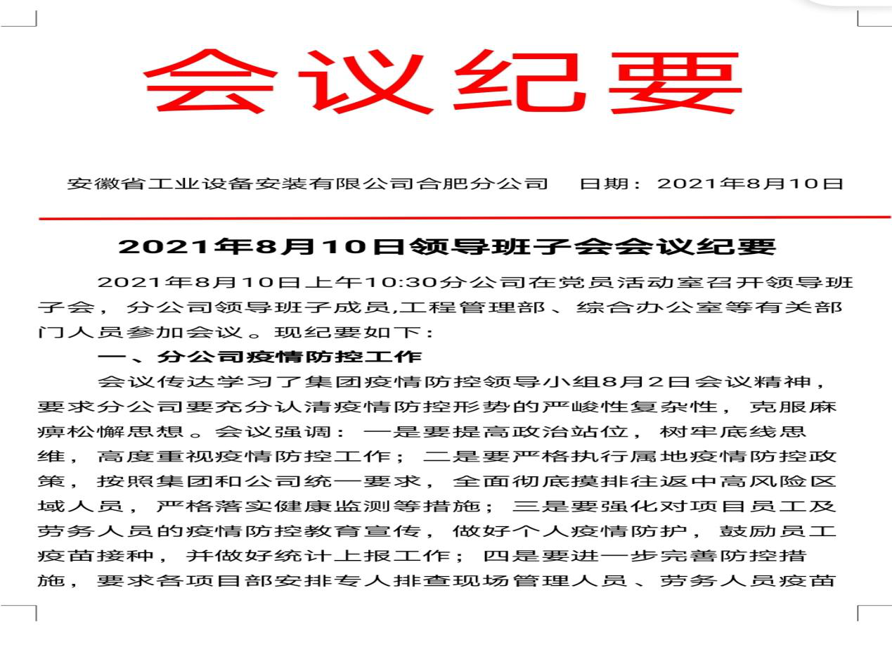 為確保疫情防控工作落實(shí)到位,合肥分公司積極行動,多措并舉,一是安排日常防疫排班表,壓實(shí)疫情防控具體責(zé)任;二是及時排查分公司員工及項(xiàng)目施工人員出行情況;三是定期安排人員對機(jī)關(guān)及項(xiàng)目辦公區(qū)域、食堂、衛(wèi)生間等進(jìn)行消毒殺菌,并及時為機(jī)關(guān)及各項(xiàng)目員工分發(fā)口罩、洗手液、消毒棉片等防疫物品;四是強(qiáng)化對機(jī)關(guān)和項(xiàng)目人員的疫情防控教育宣傳,做好個人疫情防護(hù),鼓勵員工疫苗接種,截至目前,分公司除去不適合接種疫苗人員,其他人員接種率達(dá)到100%。