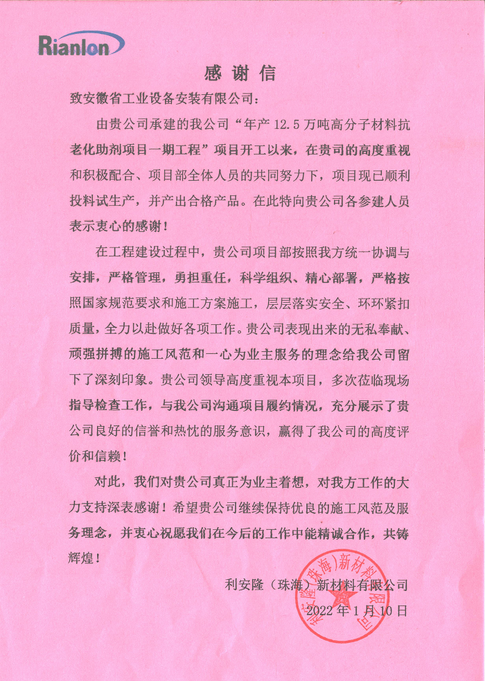 近日,利安?。ㄖ楹#┬虏牧嫌邢薰鞠虬不瞻惭b公司致感謝信,對(duì)安徽安裝公司“年產(chǎn)12.5萬(wàn)噸高分子材料抗老化助劑項(xiàng)目一期工程”實(shí)現(xiàn)順利投產(chǎn)運(yùn)行產(chǎn)出合格產(chǎn)品表示祝賀,對(duì)項(xiàng)目部全體參建人員付出的艱辛努力與貢獻(xiàn)給予感謝。